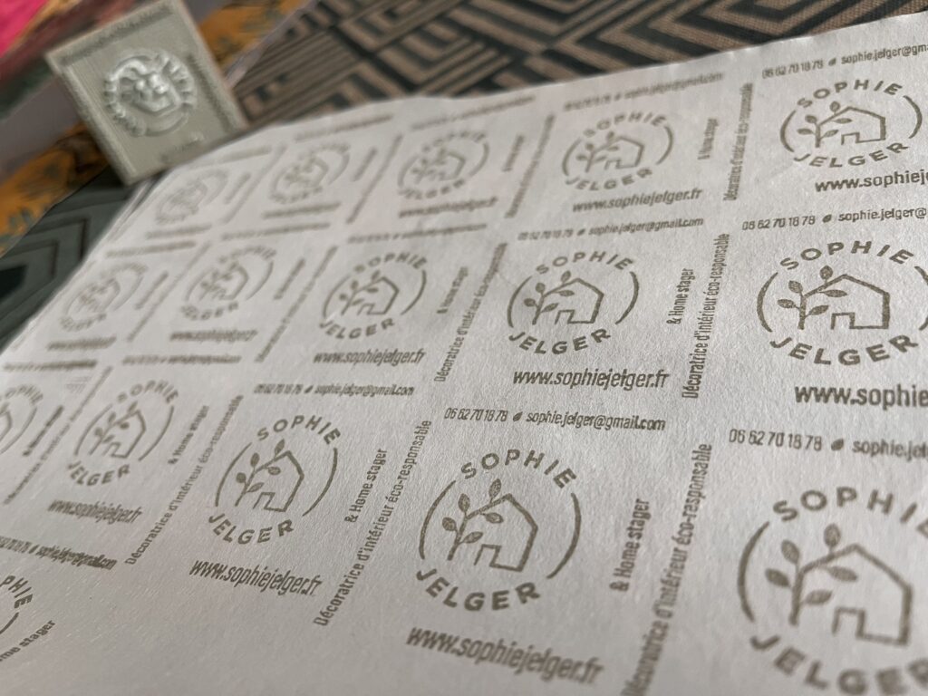 Grâce à l’atelier FerryBoât et à la Maison Trabuc, j’ai fait réaliser un tampon sur mesure. Je tamponne désormais mes coordonnées sur des chutes de papiers peints récupérées, à l’aide d’une encre végétale vert sauge et gris.